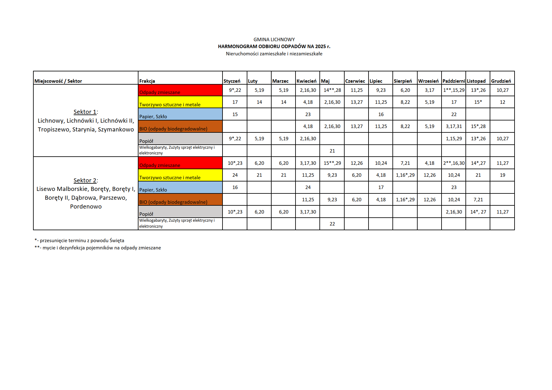 Zapraszam do obejrzenia strony „Harmonogram wywozu odpadów od 1.01.2025 r. do 31.12.2025 r. - aktualizacja październik 2025 - Harmonogram wywozu odpadów, menu 81, artykuł 1031 - BIP - Gmina Lichnowy”